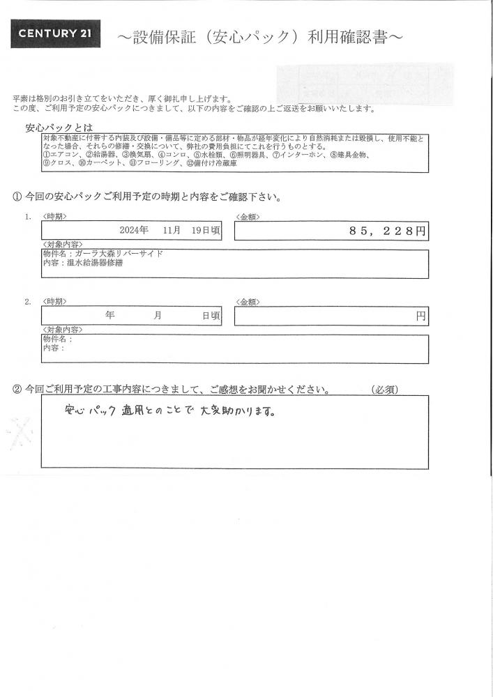 H・M様 安心パック適用とのことで大変助かります。(ガーラ大森リバーサイド)