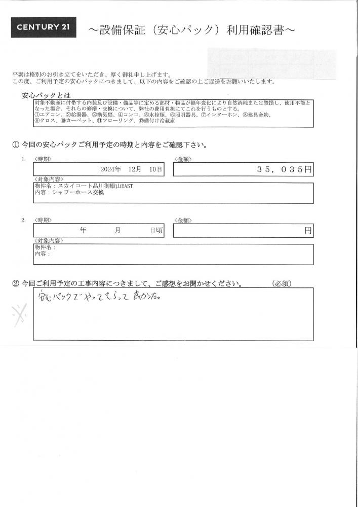 河野様 安心パックでやってもらって良かった。(スカイコート品川御殿山EAST) | 港区・中央区・品川区・江東区などベイエリアの賃貸管理のことならセンチュリー21プレミアムライフの不動産のことならセンチュリー21プレミアムライフ